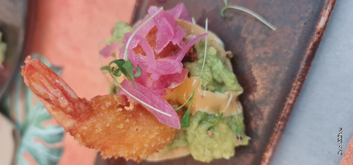 A single, golden-brown fried shrimp, breaded, stands vertically on a small, round, flat base, approximately 5 cm in diameter. The base is covered with a thick layer of mashed, light-green avocado, which has a slightly lumpy texture. On top of the avocado, there is a cluster of bright pink, thinly sliced pickled red onions. A creamy, orange-colored sauce is drizzled in an irregular pattern over the avocado and onions. Several slender, light-green microgreens are scattered across the top. This food item is presented on a rectangular plate with a dark brown, mottled, glazed surface. The background consists of a blurred, predominantly orange surface, featuring a faint pattern of green tropical leaves, likely a tablecloth. The scene is situated in Kifisia, Greece.