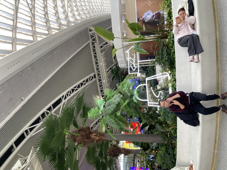 interior of a large, modern building with a high, curved, white ceiling with metal beams. Palm trees and other greenery are scattered throughout the space. Two people are sitting on a concrete bench. One person is looking at their phone, while the other is talking on theirs. There are store displays and illuminated signs in the background.