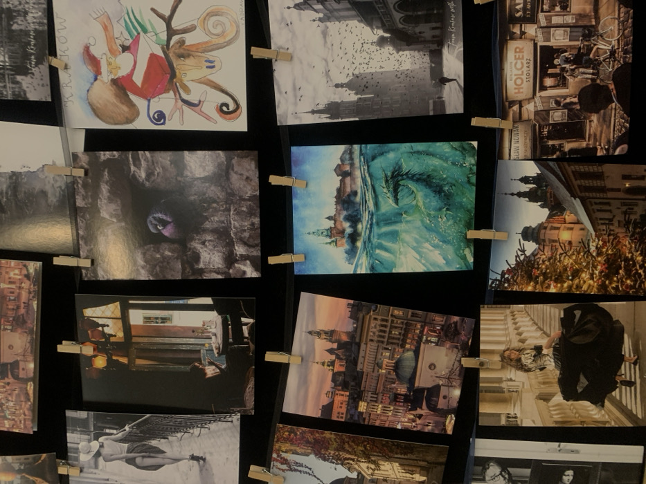 A collection of approximately thirteen postcards and prints is displayed horizontally across multiple dark strings or wires, secured by wooden clothespins against a dark, featureless background. The postcards depict various scenes, primarily focusing on the city of Krakow, Poland: - **Top Row:** Includes a whimsical illustration of Santa Claus on an antlered creature, labeled "KRAKOW," and partially visible cityscapes. - **Second Row (from left):** Features a black-and-white image of a woman walking on a bridge, an interior scene of a woman at a cafe table with an ornate chandelier, and a close-up photograph of a dark pigeon perched in a stone wall opening, characteristic of Krakow's architecture. - **Third Row (from left):** Displays a vibrant twilight cityscape of Krakow, clearly showing the Wawel Cathedral and Royal Castle complex with surrounding historic buildings and illuminated windows. Next to it is a fantasy artwork depicting Wawel Castle floating above water, with a green dragon submerged beneath, referencing the Wawel Dragon legend. To the right, a grayscale photograph captures Krakow's Main Market Square, including the Cloth Hall (Sukiennice) and St. Mary's Basilica, with a flock of birds in the sky and a lone figure on the ground. - **Bottom Row (from left):** Features a woman in a dark, flowing dress twirling on a classical architectural balcony. Adjacent is a festive winter street scene in Krakow, showing a large, illuminated Christmas tree and historic buildings under a dusk sky. The final visible postcard on the right depicts a vintage-style street view in Krakow at night, with illuminated shopfronts bearing Polish signage such as "HOLCER STOLARZ," and people walking and cycling.