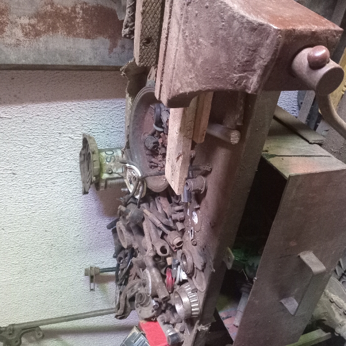 The image depicts an interior scene of a cluttered workbench, stated to be located in Duaca, Venezuela. No individuals are present. The workbench, constructed of wood and metal, is heavily laden with miscellaneous rusty and soiled metal components, including assorted bearings, linkages, fasteners, and mechanical fragments. On the left side of the workbench, these parts form a substantial pile, with a red container or tool handle partially visible. In the central area, a round, dark metal pan holds smaller metallic items, positioned in front of a white cylindrical container, partially labeled "OLEOS," which supports a circular, gridded metal object. To the right, a rectangular wooden block rests on the workbench. The prominent foreground on the right features a large, heavily rusted metal workbench vise with its brown-knobbed handle. An open, rusty metal drawer is visible beneath the workbench on the left. The background consists of a light-colored, textured wall on the left and center, with a darker, possibly stained vertical surface to the right. A slender metal pole stands against the wall on the far left. All visible metal objects exhibit advanced rust and dirt accumulation, consistent with an industrial or repair setting storing used materials.