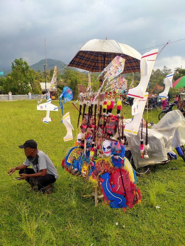 This image depicts an outdoor vendor stall in a grassy field in Sidomukti, Indonesia, under an overcast sky. In the foreground, a male individual, appearing to be the vendor, is squatting on the grass. He wears a black baseball cap, a grey t-shirt, dark pants, and sandals. His right hand holds a small, white object, possibly a cigarette, while his left hand holds a smartphone. To his right, a makeshift sales display is set up. A large, brown and white plaid umbrella provides shade over a collection of merchandise. The items for sale include multiple large, white, airplane-shaped kites or gliders with red and blue accents, several smaller patterned kites, and numerous masks. The masks vary in design, featuring distinct clown faces (white with red features, blue hair) and other brightly colored, animal or monster-like designs with faux fur and tassels. These items are hung on wooden poles and displayed on a simple wooden stand. Behind the stand, a blue motorcycle is partially visible, covered with a white tarp, suggesting it may also be part of the display or transport. The background reveals a large green field extending towards a distant line of trees and hills/mountains under a cloudy sky. Scattered structures, including a white-fenced building and what appear to be houses, are visible among the trees. Further in the background, more people and motorcycles are present, along with a partially visible green umbrella, indicating other vendors or activities. A tall antenna or pole stands on one of the distant hills.