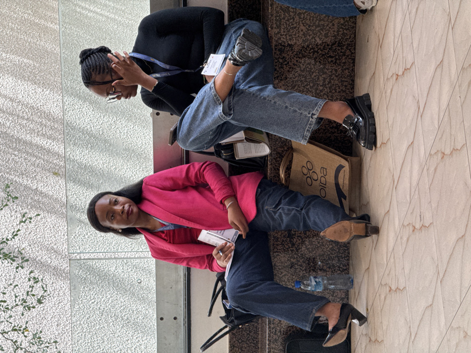 Two adult females are seated on a multi-tiered, dark speckled granite-like surface in Itirin, Nigeria. The female on the left wears a bright pink blazer over a red top, blue jeans, and black high-heeled pumps, with one shoe partially off her foot. She holds white documents and a pen. A black handbag rests to her left, and a plastic water bottle is on the light-tiled floor below her. The female on the right, wearing eyeglasses and with her hair styled in braids, wears a black long-sleeved top and blue jeans, paired with black chunky-soled loafers. She holds a smartphone in her right hand and has her left hand near her face. Both individuals wear white identification badges suspended from blue lanyards. A brown "oiba" branded paper bag is positioned on the floor between them. The background consists of a textured light-grey wall with a horizontal metal beam, and sparse green foliage is visible above.