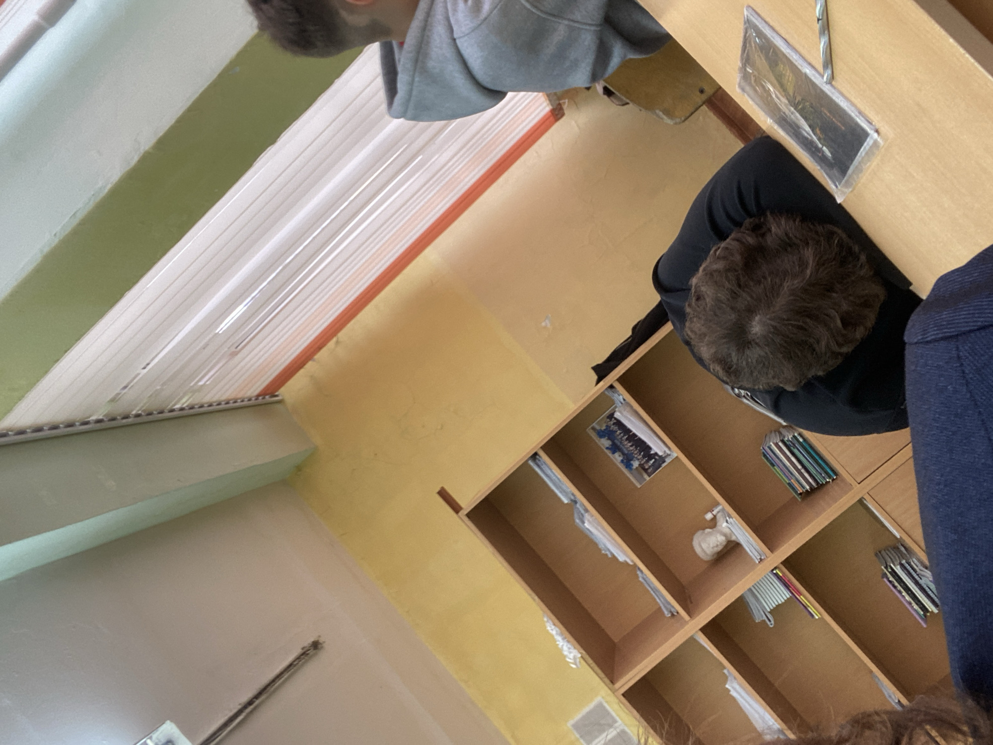 The image depicts an indoor scene, specifically an educational setting resembling a classroom or study hall, located in Naberezhnye Chelny, Russia. The exact address or specific institution within the city is not identifiable from the visible details. The room features walls painted yellow, with a horizontal light green stripe running below the ceiling, which is light-colored. In the upper left, a metallic conduit or fixture is attached to the ceiling. A window on the right side of the frame is fitted with white horizontal blinds and has an orange-red frame. Against the left wall, a wooden modular bookshelf unit is visible, filled with numerous books, notebooks, and papers. Among the items on the shelves are a small white bust of a head (likely classical) and a framed group photograph. Three individuals are partially visible. In the foreground, the top of a head with reddish-brown curly hair, wearing a dark blue garment, is seen, indicative of the photographer's perspective. Immediately beyond this, a person with short, dark brown curly hair, wearing a black long-sleeved shirt, is resting their head on their forearms on a light-colored wooden desk. Adjacent to this individual on the desk are a clear plastic-wrapped item, appearing to be a booklet or small electronic device, and a silver-colored pen or stylus. In the background on the right, the back of a person's head with dark hair, wearing a grey hooded sweatshirt, is visible as they are seated at a desk. No active interactions between the individuals are observable.