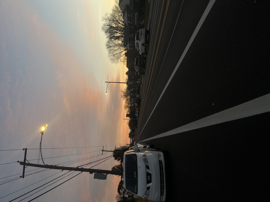 This image captures a residential street scene in Philadelphia, United States, at twilight. The sky displays a gradient of orange, pink, and light blue hues, indicating either sunrise or sunset. The perspective is from a low angle, looking down a recently paved, multi-lane asphalt road. The roadway is marked with crisp white solid lines on the edges and double solid yellow lines in the center, designating separate directions of travel. On the immediate left, a white Nissan NV200 van is parked facing away from the viewer, with its front fascia, grille, and headlights visible. Another vehicle is partially obscured behind it. A prominent wooden utility pole on the left supports multiple power lines and a brightly illuminated street light, casting a visible flare. Further down the street on the left, another utility pole is present. Along the right side of the road, a dark-colored SUV is parked, followed by a white Nissan Rogue SUV. Additional vehicles are parked further in the distance. A row of two-story residential houses lines the right side of the street, partially obscured by bare deciduous trees, suggesting late autumn or winter. Another illuminated street light is visible further down the road on the right. No individuals are discernible in the scene.