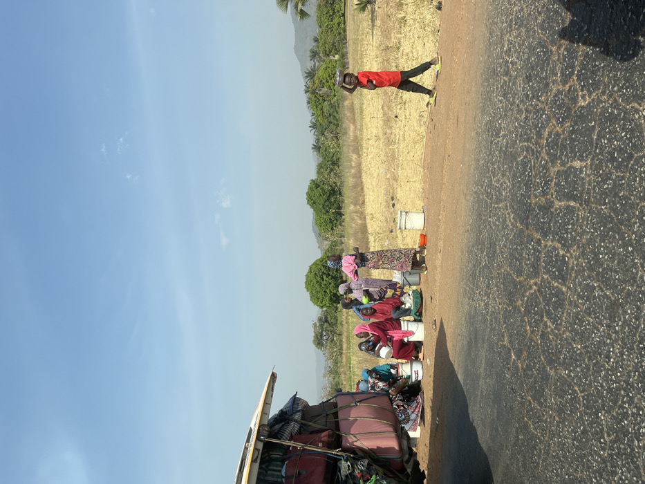 An outdoor scene in Aboro, Nigeria, depicts a roadside environment under a clear blue sky with minimal cloud cover. In the foreground, a heavily cracked asphalt road is visible, transitioning to a light brown, sandy shoulder on the right. On the far left, a white vehicle, likely a bus or large van, is partially visible, its roof rack heavily loaded with various pieces of luggage, including pink-covered items resembling mattresses or bedding, secured with ropes. To the right of the vehicle, a group of approximately six to seven individuals, mostly women and children dressed in diverse traditional attire with head coverings, are gathered. Several are seated on the ground or low objects, while one woman in a pink top and patterned skirt stands upright. Multiple white and red buckets or containers are placed on the ground in front of the group. Further to the right, a young boy walks from the right side of the frame towards the left, wearing a red short-sleeved shirt, dark pants, and yellow shoes. He balances a circular, flat object, consistent with a platter or bowl, on his head. The background consists of a dry, yellowish field, a line of green trees, and distant hills under a hazy sky.