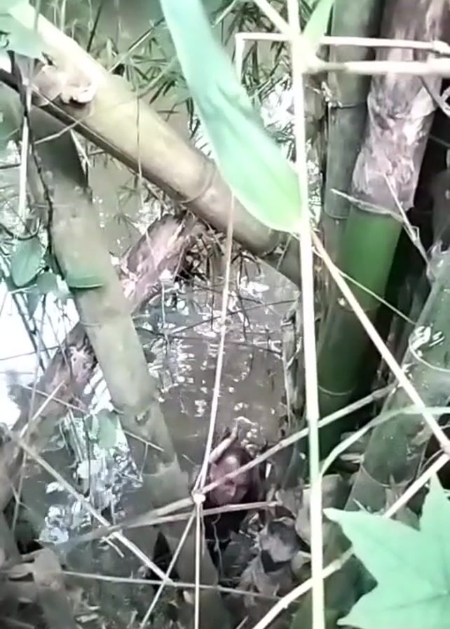 person using a machete to chop down bamboo stalks. The camera looks upward through the dense bamboo forest, focusing on the person's hands and the act of cutting. The cut bamboo falls towards the camera.