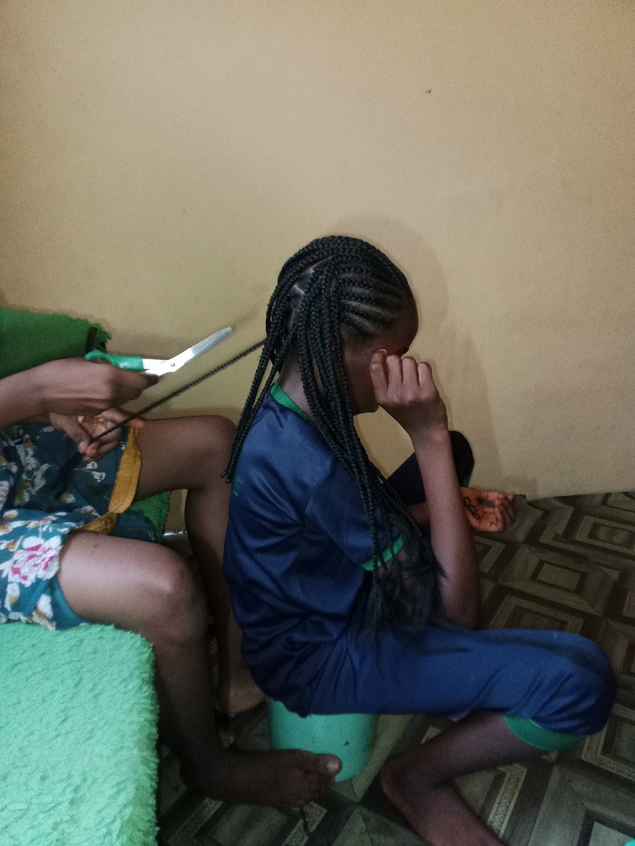 The image depicts an indoor scene in Iju, Nigeria, where one individual is braiding the hair of another. On the left, a person, partially visible and seated on a green fuzzy cushion, is shown from the waist down, wearing a floral patterned garment. Their right hand holds a pair of green-handled scissors, actively trimming the end of a dark braided strand of hair. On the right, a younger individual with dark skin, wearing a blue shirt with green trim and blue pants with green ankle trim, is seated on a green plastic bucket. Their hair is styled in numerous tight cornrows leading into long individual braids. The individual's right hand is raised, touching or covering their face near the eye area. Both individuals are barefoot. The background consists of a plain light brown wall above a tiled floor featuring a geometric pattern in shades of brown.