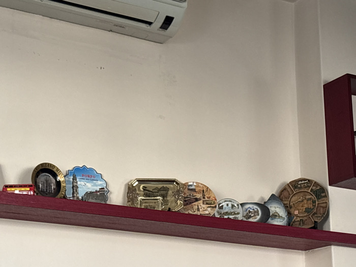 An interior scene in As-Salihiya Municipality, Syria, displays a collection of items on a wall-mounted shelf. A white air conditioning unit is positioned high on the off-white wall in the upper left quadrant. The wall itself shows minor discolorations. Below this, a dark red, narrow wooden shelf extends horizontally across the frame. The shelf holds various souvenir items arranged from left to right: a miniature red double-decker bus, a round black souvenir plate or magnet with "MILANO" text, a blue, irregularly shaped souvenir plate or magnet depicting a tower and "PORTO" text, and a rectangular golden plate with embossed designs. Further to the right are several additional souvenir plates and magnets of different shapes and designs, including a spherical item. The collection concludes with a large, multi-segmented circular wooden or ceramic plate, possibly featuring "BUDAPEST," situated near the right edge of the frame. A dark red vertical structure, likely a shelving unit or cabinet, is partially visible in the upper right, forming a corner with the white wall. No individuals or active events are present in the image.