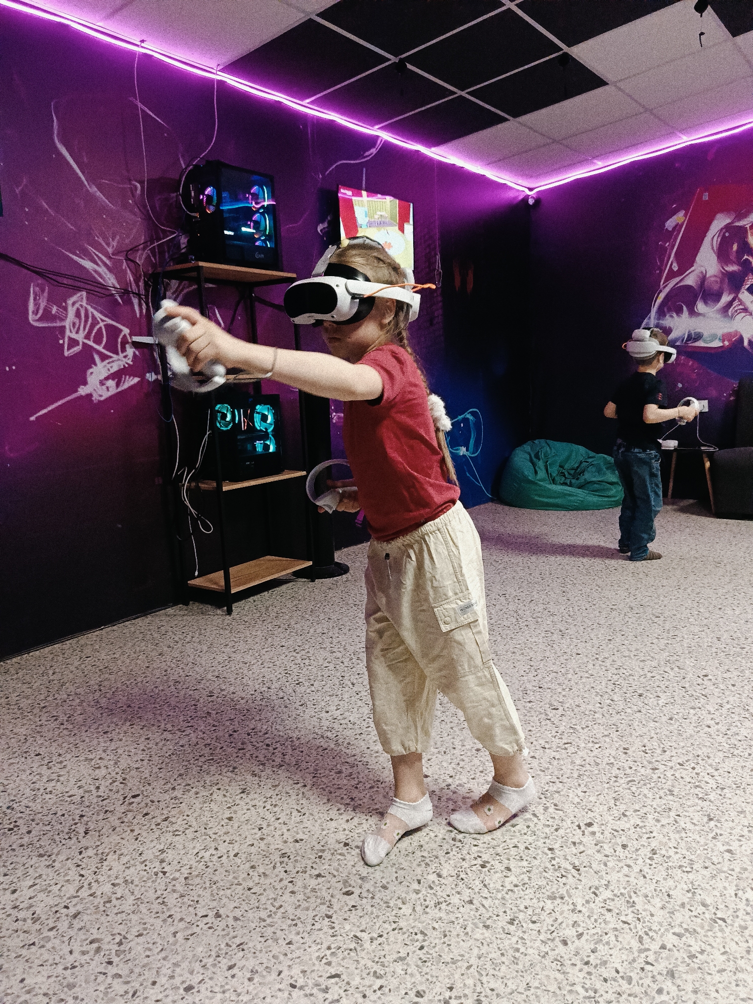 Inside a room illuminated by purple neon lights, two children wearing VR headsets play games