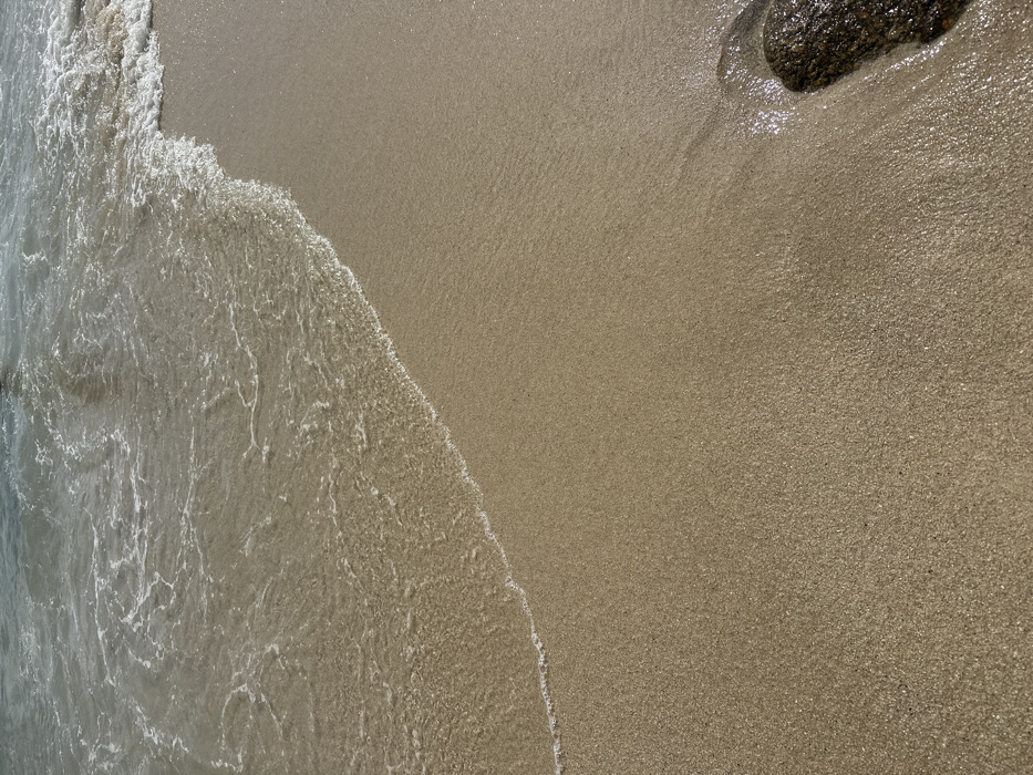 beach where the sea meets the sand. The upper right corner has dry, tan sand, while the lower left is wet from the shallow water. The water is a light grey color with white frothy waves washing onto the shore. A dark, round rock is in the top right corner where the sand is wet. The sand texture changes from grainy on the dry side to smooth on the wet side.