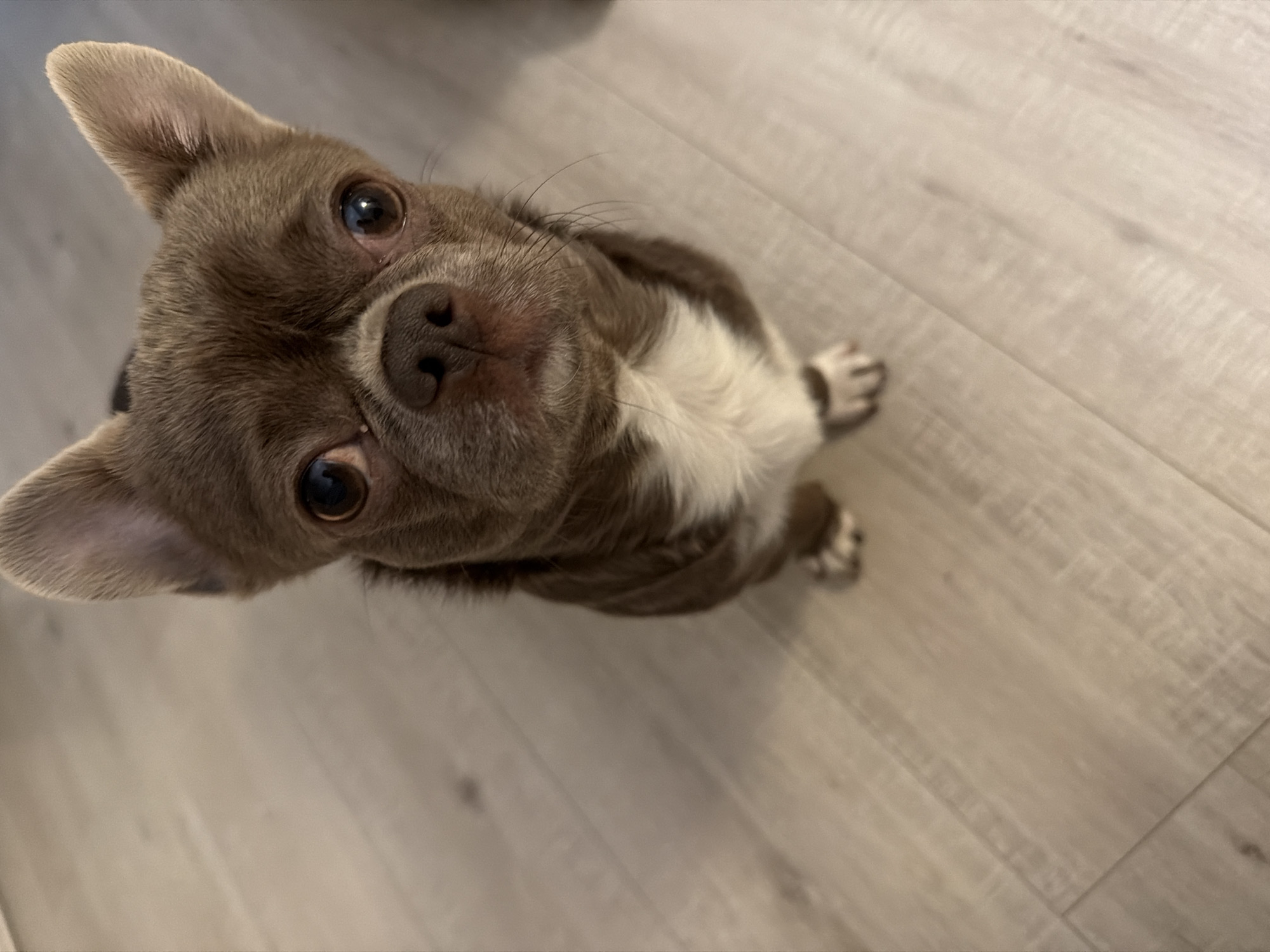 A small brown and white chihuahua dog is looking up at the camera. The dog is sitting on a light wood-patterned floor. The dog's body is partially visible, showing a white patch on its chest. The dog's ears are upright, and its eyes are wide and brown. The background is a plain floor. There is no indication of the location being Votkinsk, Russia or any specific city.