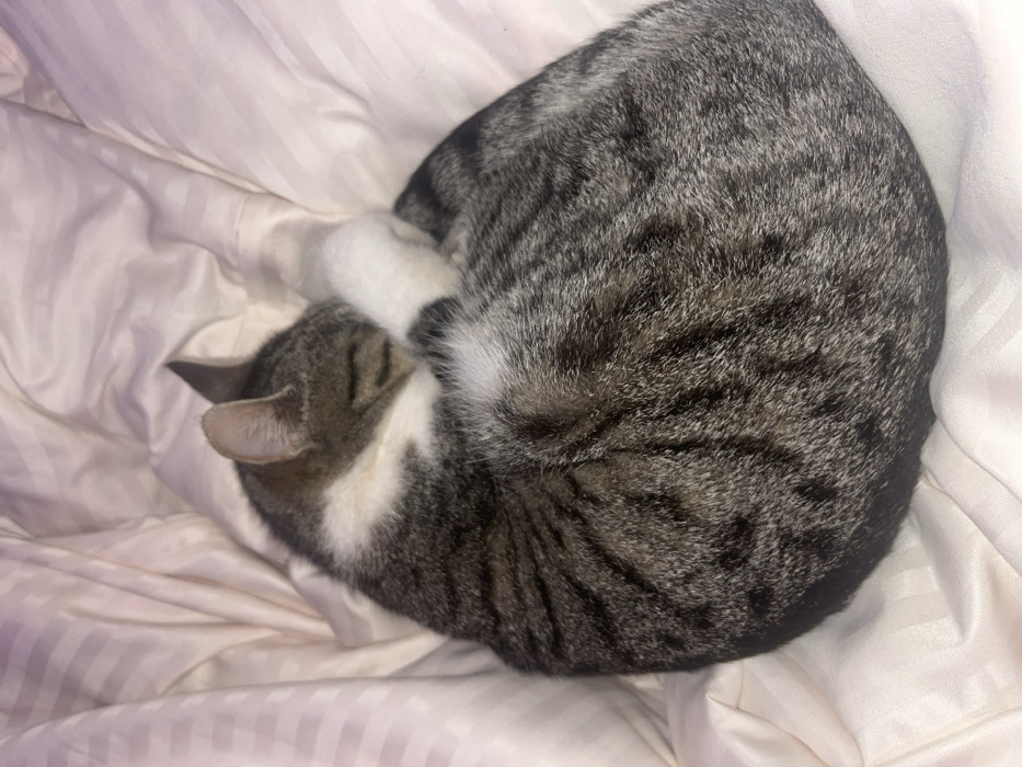 One domestic cat is observed resting on a light-colored, vertically striped textile surface. The cat is curled into a tight spherical posture, with its head tucked inwards and its front paws covering its facial area. Its pelage displays a grey and brown mackerel tabby pattern across its back and sides, with distinct white markings on its ventral chest, belly, and paws. The environment consists solely of the bedding material, which appears to be a blanket or duvet with faint linear textures. No other subjects or objects are present. The scene is located in Unknown, Unknown.