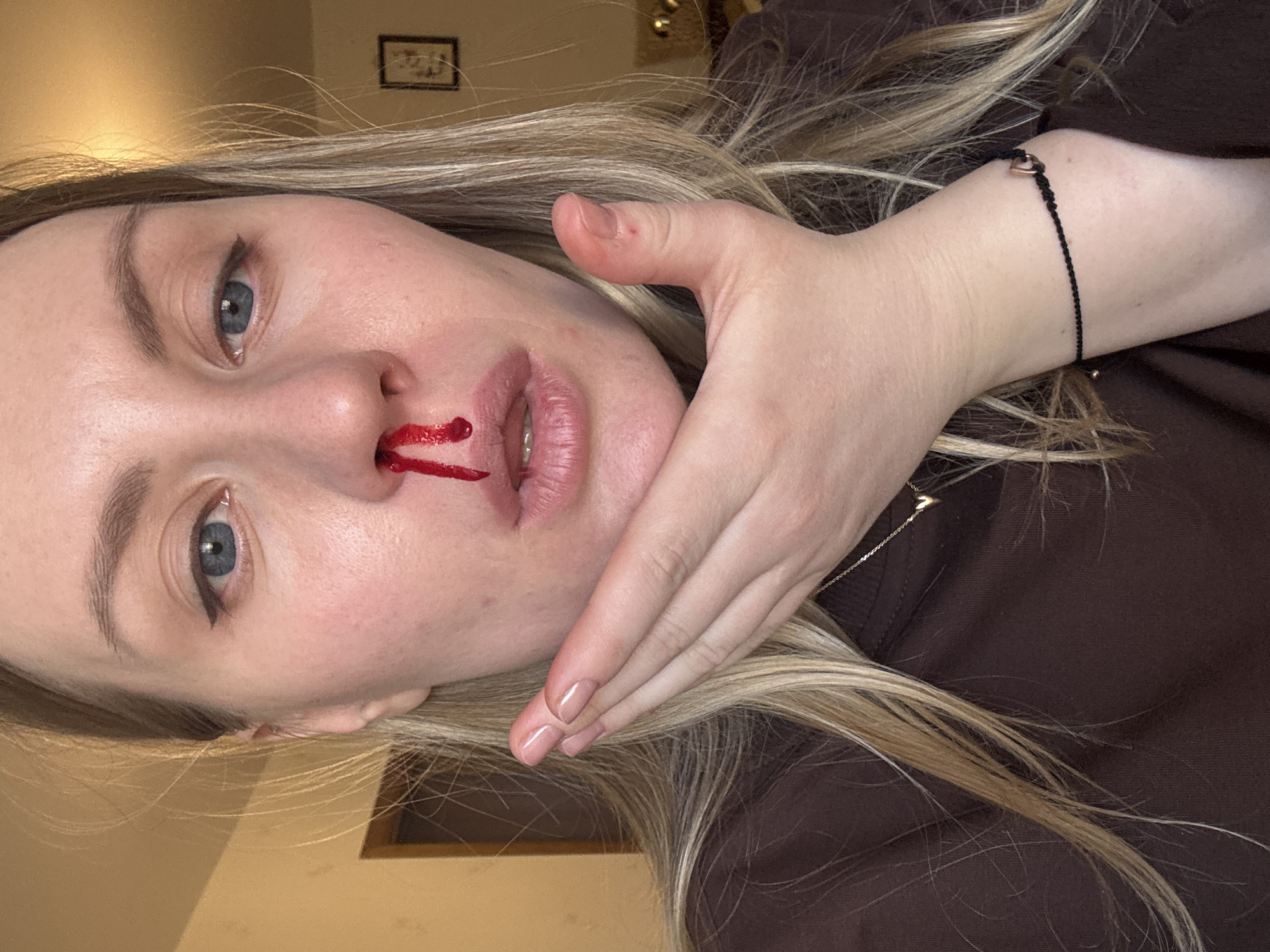 The image displays a close-up, chest-up portrait of an adult female located in Moscow, Russia. She has light skin, blue eyes, and long, straight blonde hair. Her gaze is directed forward, meeting the camera lens. Bright red blood is actively flowing from her right nostril, tracing a path down her philtrum towards her upper lip. Her mouth is slightly open. Her right hand is positioned beneath her chin, fingers slightly curled, revealing nails manicured with a light, natural-toned polish. She is dressed in a dark brown long-sleeved garment. A thin, gold-colored chain necklace with a small, minimalist metallic pendant is visible around her neck. A thin black cord bracelet with a small metallic heart-shaped charm is worn on her left wrist. The background depicts an indoor environment, characterized by light-colored walls, a dark wooden door frame partially visible on the left, and a framed item hanging on the wall to the right.