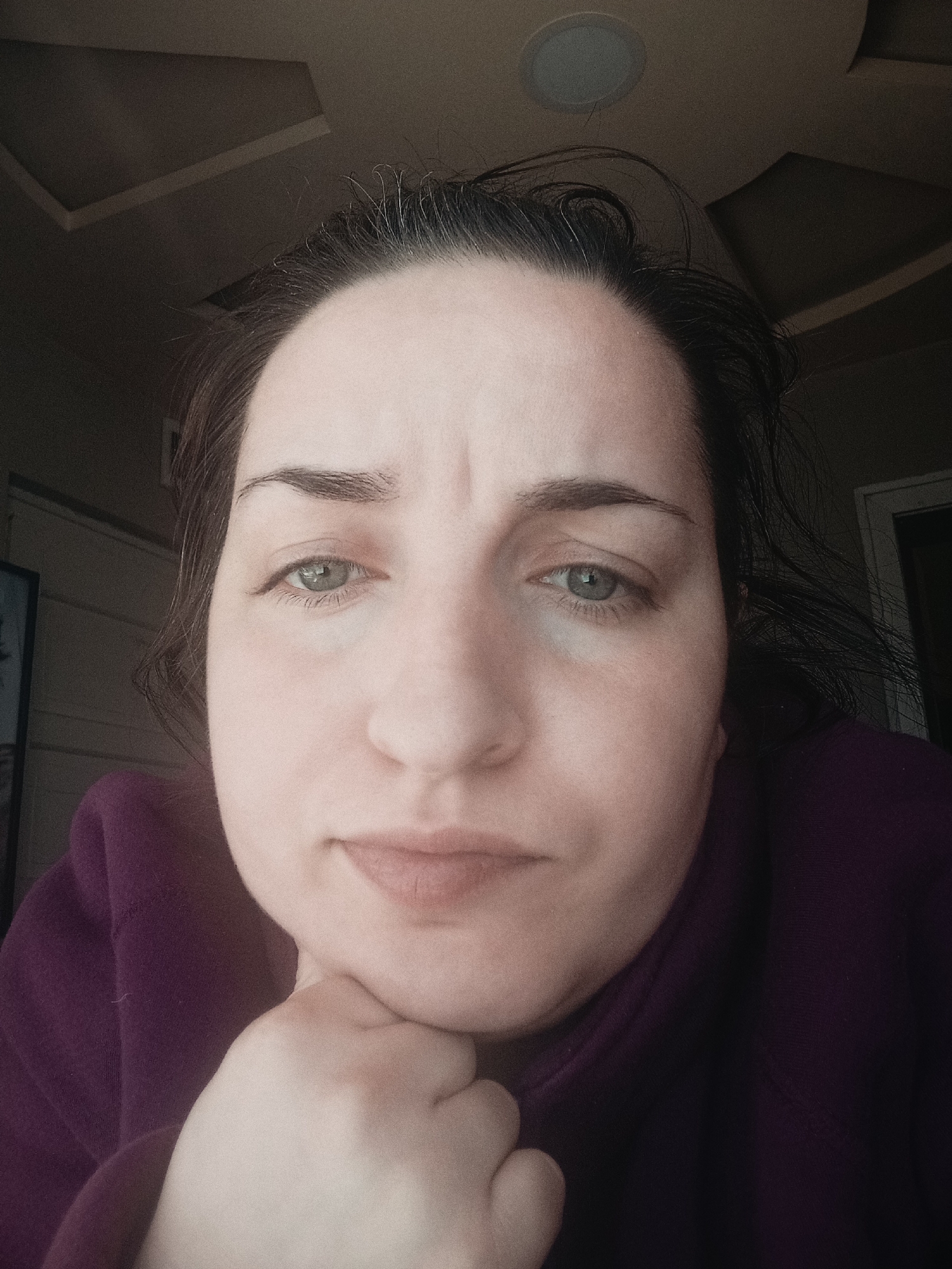 A close-up, low-angle, indoor photograph shows a woman with light skin, dark hair, and light eyes. She is wearing a dark purple hooded sweatshirt and resting her chin on her hand. Her expression appears neutral or slightly pensive. The background is a ceiling with recessed lighting and rectangular ceiling panels. The location is not discernible as Tipchenitsa, Bulgaria.