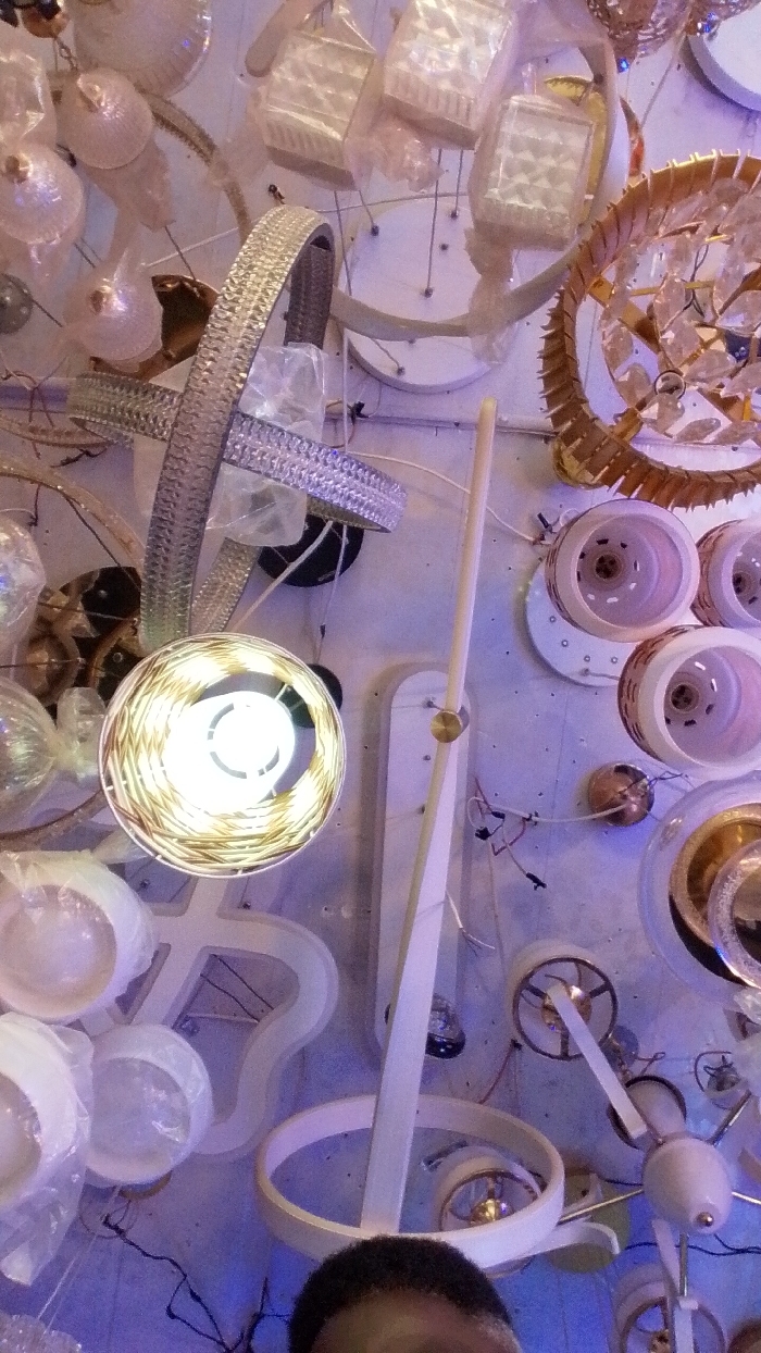 - "This image depicts an overhead view of a densely arranged display of various light fixtures in a commercial setting, specifically located in Shaba, Nigeria" by FM-lA8rH3, licensed under CC BY 4.0