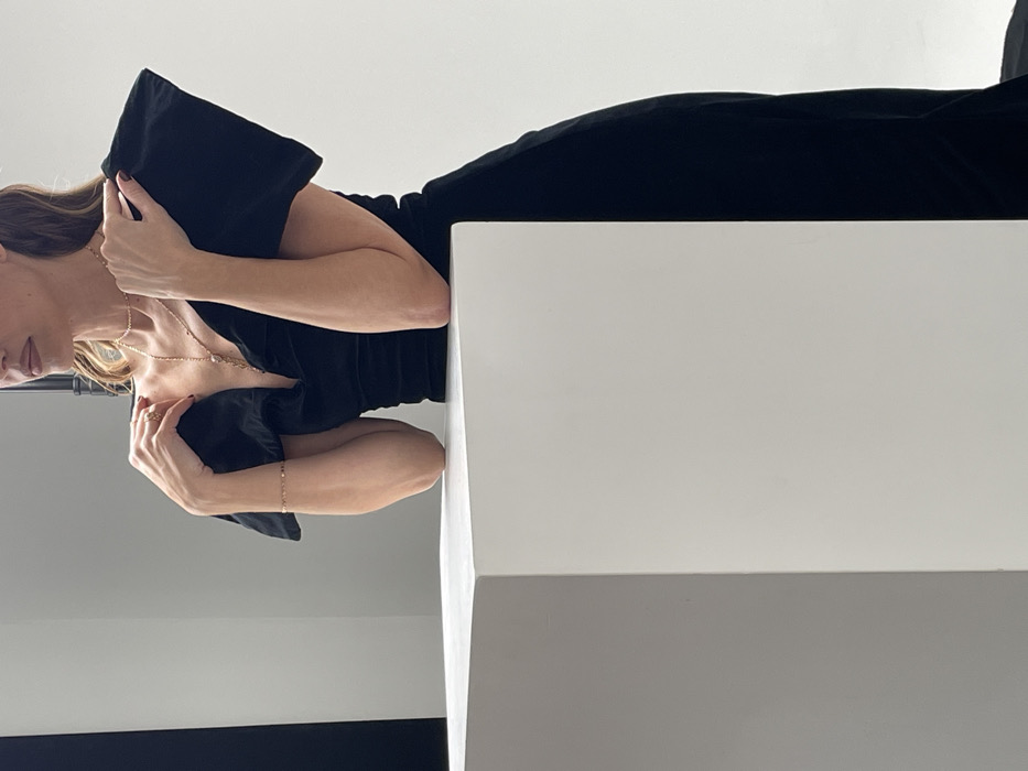 This is an indoor studio photograph, likely originating from the City of Zagreb, Croatia. The image features a female subject positioned center-right, visible from just below the eyes to mid-thigh. She has fair skin and light brown hair partially visible on the right side. The subject is wearing a black, possibly velvet, dress with a deep V-neckline and prominent, structured short sleeves. She is adorned with several gold-colored jewelry pieces, including a choker necklace, a longer layered necklace with a pendant, a bracelet on her left wrist, and a ring on her left ring finger. Her elbows are resting on the top surface of a large, white, rectangular cube positioned in the foreground, and her hands are raised, with fingers gently touching her collarbone area and shoulders. The background is minimalist, consisting primarily of a plain white wall or backdrop, with a vertical black panel visible on the far left, and faint studio equipment visible behind the subject's left shoulder. The scene is evenly lit with bright, soft light, characteristic of a professional studio setup.