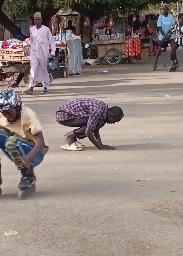 On a paved road in an outdoor market setting, a roller skater in a gold shirt, jeans, and a helmet jumps over a crouching individual wearing a plaid shirt and sandals, who has his hands on the road. Other individuals are roller skating in the background. The scene is captured in daylight. Several market stalls and pedestrians are visible in the background, including individuals dressed in traditional attire.