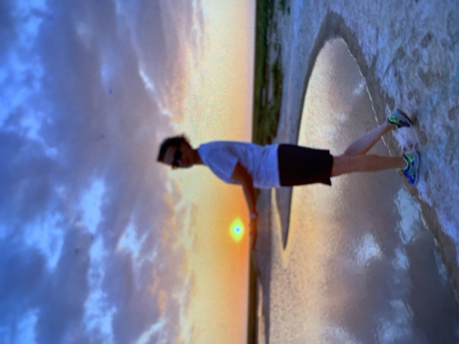 An out-of-focus photograph depicts a single individual standing on the light-colored bank of a body of water during sunset in a natural area within Chaikovsky, Russia