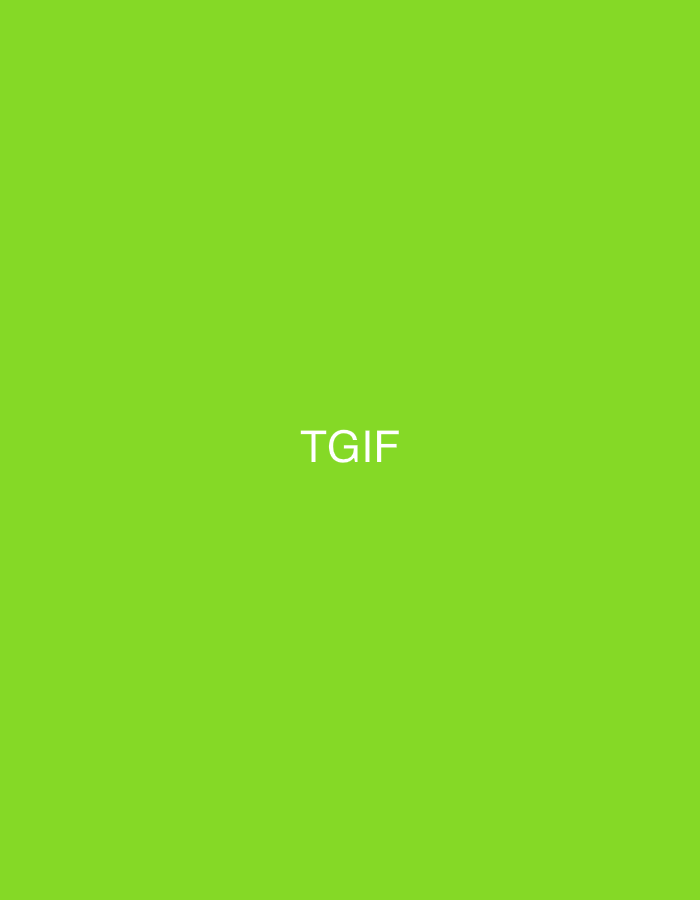 The image displays a solid, uniform field of lime green color. White, sans-serif text, "TGIF", is centrally positioned on this monochromatic background. No discernible location, people, subjects, objects, actions, interactions, or specific environmental details are present in the image that could relate to the city of Kazan, Russia, or any other real-world setting beyond the abstract green field and text.
