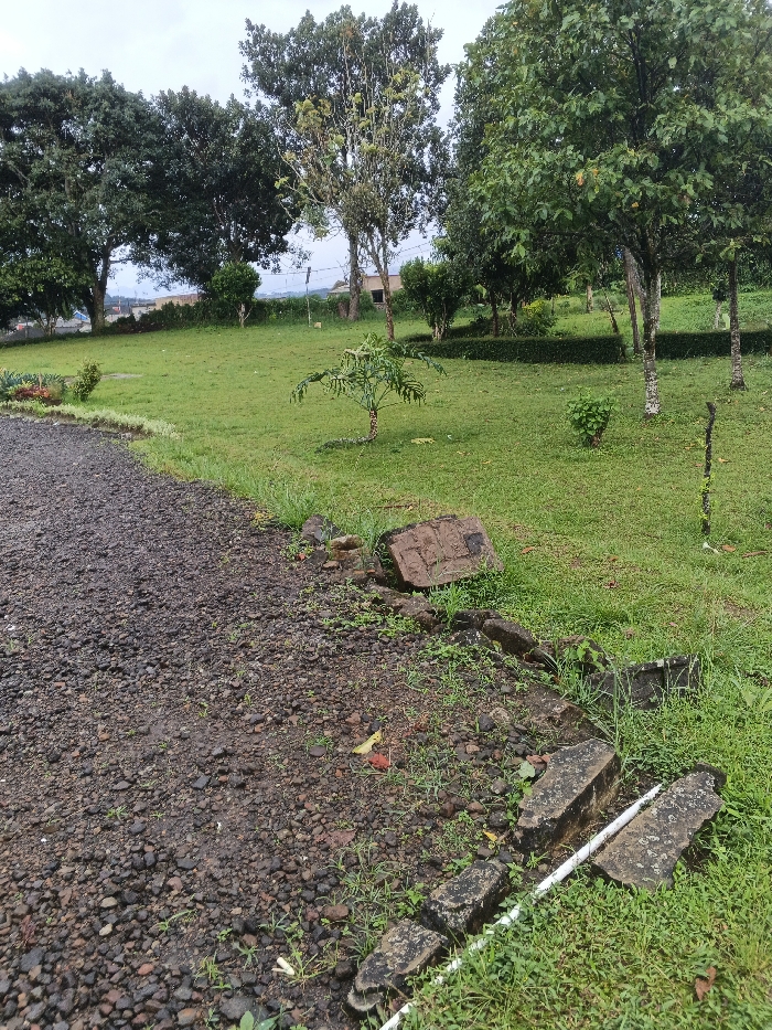 The image displays an outdoor scene in Tapaiteng Uesa, Bhutan, characterized by a gravel path bordering a grassy area with scattered trees. The foreground on the left features a dark, wet-appearing gravel path composed of small, dark, irregular stones. Along the right edge of this path, defining its boundary with the grass, are several broken and displaced concrete or stone border sections. One large, rectangular block, dark brown or grey, lies at an angle in the grass directly adjacent to the path. Below it, a line of smaller, broken dark grey blocks and a segment of a white pipe or conduit are visible, partially obscured by green grass and weeds. The midground is dominated by an expanse of mown green grass. A small, broad-leafed tree with a slender trunk stands centrally within this grassy area, accompanied by a smaller bushy plant to its right. Numerous other trees, varying in size and foliage density, are distributed across the grass. These include several mature trees with dense, dark green canopies on the left side of the midground, and more slender trees with lighter bark and lighter green leaves towards the right. A low, dark green hedge or line of shrubs forms a horizontal demarcation in the far midground. In the background, behind the trees, indistinct structures or buildings with light-colored facades are partially visible, suggesting an adjacent developed area. The sky is overcast and light grey. No individuals, specific actions, or interactions are depicted within the scene.