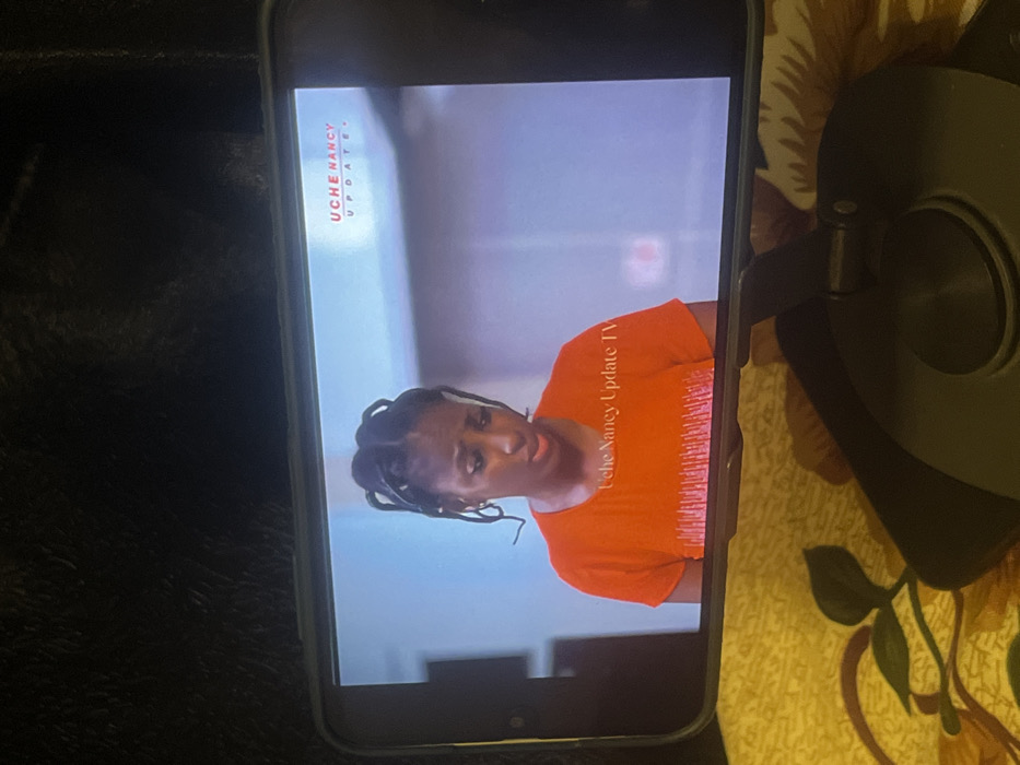 A dark-haired woman on a phone screen wearing an orange t-shirt labeled "Uche Nancy Update TV" is visible. Her hair is pulled back in braids. "Uche Nancy Update" is printed in small, red letters in the top left corner of the screen. The phone is angled, and a set of headphones is positioned to the right. The phone rests on a dark surface, partially obscured by a patterned surface.