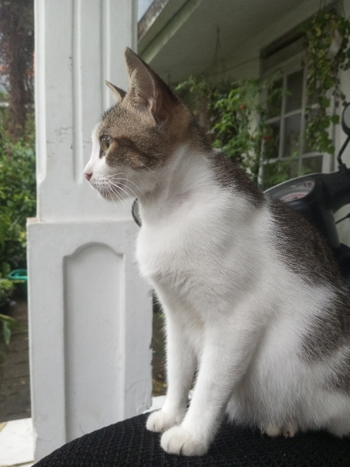 An domestic shorthair cat, predominantly white with brown tabby markings on its head, ears, and back, is depicted in profile, facing left, its gaze directed forward. The cat, exhibiting green eyes and white whiskers, is seated upright on a black, textured surface, possibly a scooter seat. A dark-colored collar is visible around its neck. To the immediate left of the cat is a white, fluted architectural column. The background features dense green foliage and vines, partially obscuring a white building with a multi-pane window. A dark-colored scooter or motorcycle is partially visible behind the cat to the right. The scene is illuminated by ambient daylight. The location is the city of Ura-Dozhi, Bhutan.