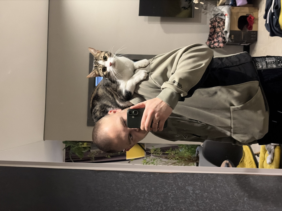 The image depicts a male individual taking a mirror selfie indoors, in the city of Lipetsk, Russia. The man, with a shaved head, is shown from the chest up, holding a dark-colored smartphone in his right hand. He wears a two-tone hoodie, light olive green on the upper section and black on the lower and sleeves, featuring a front pouch pocket. A metallic ring is visible on his left ring finger. A domestic short-haired cat, with brown/grey tabby markings on its back and white fur on its chest, paws, and face, is perched on the man's right shoulder, looking directly forward with alert eyes. The background, reflected in the mirror, reveals an indoor setting with light grey painted walls and a darker, textured wall section to the left. Visible objects include several potted plants; one large green plant in a grey pot and another smaller plant in a yellow pot are behind the man's left shoulder. To the right of the frame, a television screen is partially visible, below which is a cluttered area containing a cardboard box with a cutout opening and various items of clothing or textiles on the floor. A yellow cushion or pet bed is also discernible on the floor to the left of the frame.