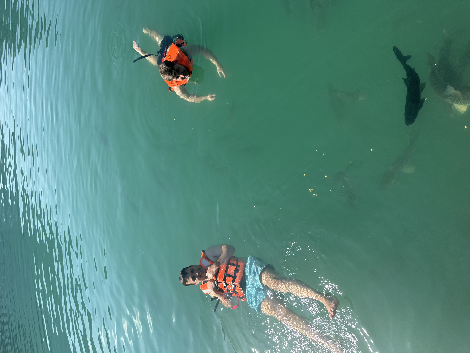 Two people are floating in green water, wearing orange life vests. One person is located in the upper center of the image, while the other is towards the lower center. Several dark shapes of fish are visible in the water to the upper right of the top person. The photograph appears to be taken in Khao Phang, Thailand.