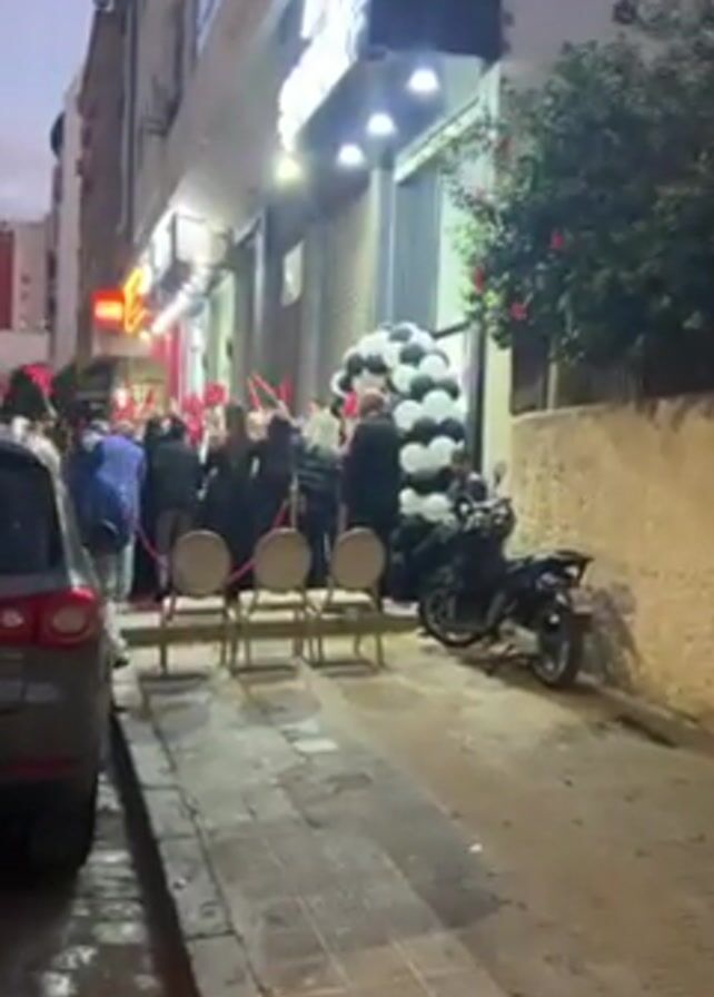 group of people standing outside a building, likely for a celebration or opening. The building has a black and white balloon arch at the entrance. There are red decorations hanging above the crowd and along the building's facade. Some people are waving what appear to be small flags. Three chairs are placed in front of the crowd on the sidewalk. A gray car is parked on the left side of the frame and a scooter is parked on the right. The sidewalk is paved with textured tiles. The sky is a dusky blue. One person in the foreground is holding up a phone, presumably to take a picture or video. There's an audible background noise which seems to be celebratory music or chanting.
