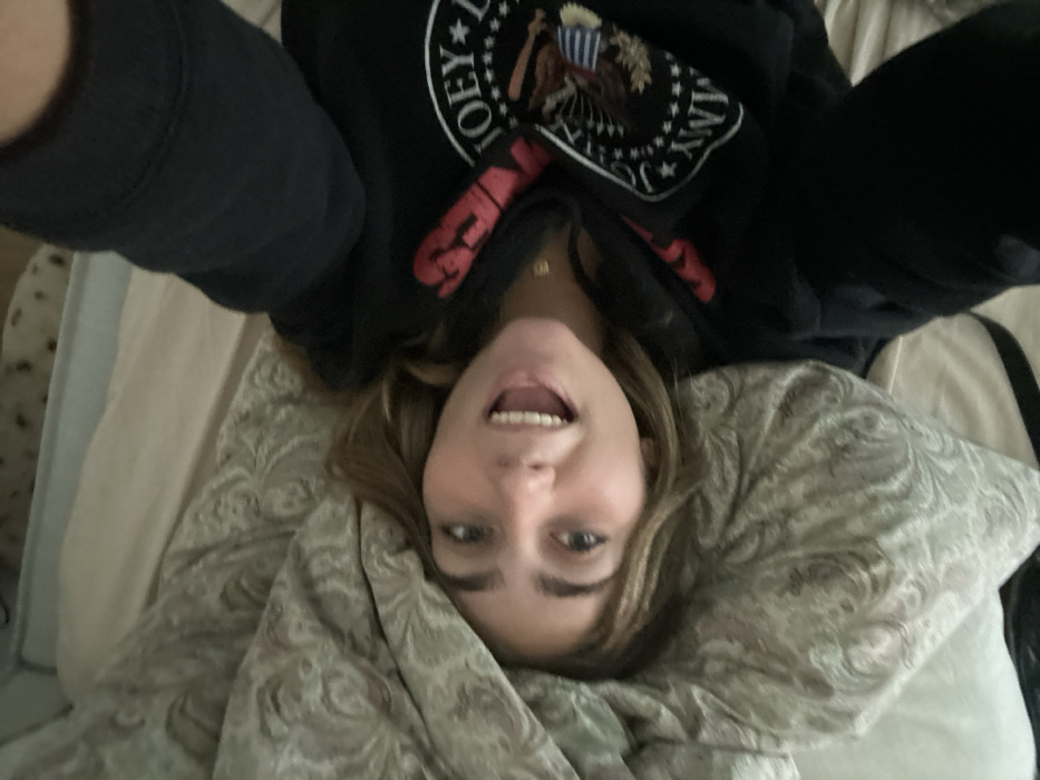 A single individual, appearing to be a young female with light brown hair, is captured in a close-up, rotated selfie image while lying on her back on a bed