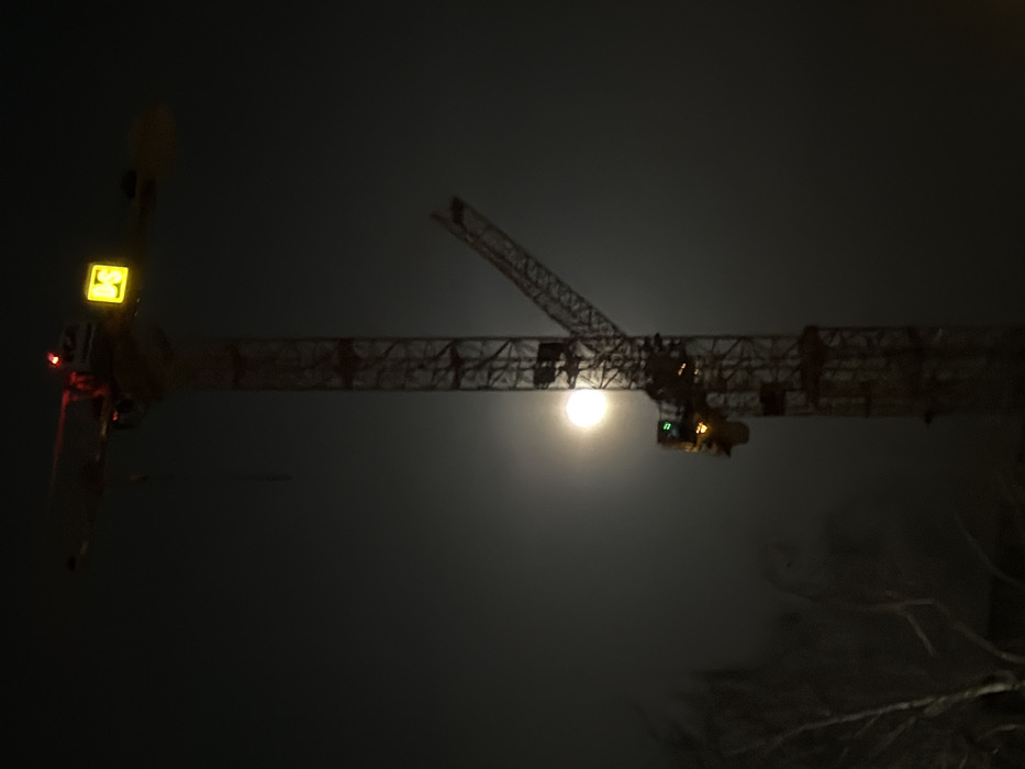 The scene depicts a nighttime view of a construction site in Heidelberg, Germany. A prominent tower crane stands centrally, its tall lattice mast extending vertically into a dark, hazy sky. The crane's upper structure displays a lit square yellow sign with the digits "53" and multiple red safety lights on its horizontal jib. Further down the mast, green and amber lights are illuminated. A bright, full or near-full moon is positioned behind and slightly to the left of the main crane's mast, casting a diffuse glow. The jib of a second, smaller construction crane is partially visible to the right of the main crane, suggesting an extensive building area. Bare tree branches are partially discernible in the blurred foreground on the far left. No individuals or active construction operations are present.