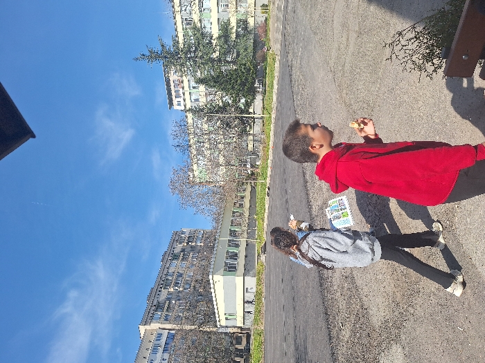 The image depicts an outdoor urban scene in Stara Zagora, Bulgaria, on a clear, sunny day. In the foreground, a young male wearing a red hooded sweatshirt and dark pants is visible from the waist up, facing left in profile. He is holding a light-colored food item, possibly a pastry, to his mouth with his right hand. To his left and slightly behind, a young female with dark, curly hair tied back walks away from the camera. She wears a grey hooded sweatshirt, dark pants, and light-colored sneakers, and carries a white sheet of paper or booklet with colorful graphics in her left hand. Her right hand is near her mouth. The ground is a paved asphalt surface, appearing somewhat worn, with scattered small debris. In the background, several buildings are visible under a bright blue sky with sparse, wispy white clouds. To the left, a tall, multi-story residential building with numerous windows and balconies dominates the skyline. In the center, a lower, two-story building with a pale green facade and many windows is present. To the right, another multi-story building is partially visible, alongside several bare deciduous trees and two prominent evergreen conifers. Two indistinct figures are visible walking in the distant background near the central building. A dark, angular object, possibly an architectural overhang, is present in the top right corner, and a segment of a wooden bench or similar structure is in the bottom right foreground, partially in shadow. The sunlight is strong, casting distinct shadows.