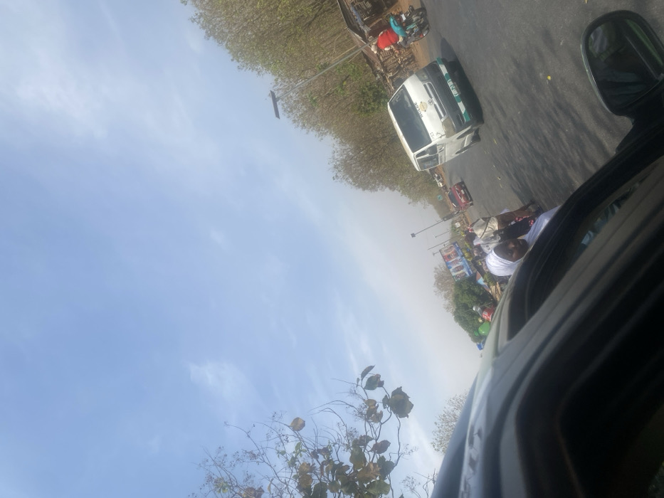 This image presents an angled, wide-angle view of a roadside scene in Gidan Waya, Nigeria, under a bright, clear blue sky with minimal cloud cover. The shot is taken from inside a dark-colored vehicle, with a portion of its window frame visible in the lower left foreground. A tree branch with sparse, dry leaves extends into the upper left. A paved asphalt road occupies the midground, with vehicular traffic present. A white Toyota Hiace-style passenger van, featuring green accents on its lower front bumper, is prominent on the road, oriented slightly towards the right. Further down the road on the right, a person on a red motorcycle is visible near a small, rustic structure. On the left side of the road, a busy market or vendor area is evident, with several individuals visible among various goods displayed on the ground and on rudimentary stalls. One woman, wearing a white head covering and a light-colored garment, is positioned near the vehicle from which the photo was taken, looking directly towards the camera. In the background, a large billboard with multiple panels is visible behind the market. The far background along both sides of the road features dense lines of trees with dry, sparse foliage, consistent with a dry season environment. A street lamp post with a solar panel top is visible on the right side of the road.