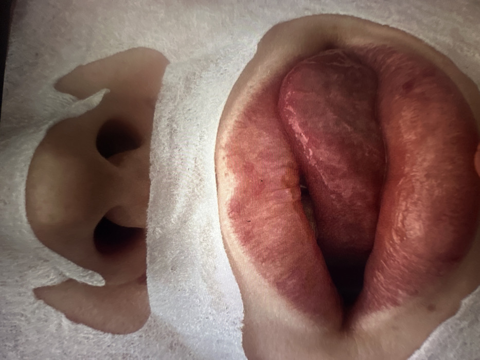 A close-up image shows a person's face covered with a white sheet mask. Holes are cut out for the nose. To the right of the nose, the mask has been removed, revealing reddened skin, possibly from a chemical peel or similar treatment. The exposed area exhibits a shiny, slightly swollen appearance with uneven coloration. The mask's texture is visible, contrasting with the smooth skin beneath.