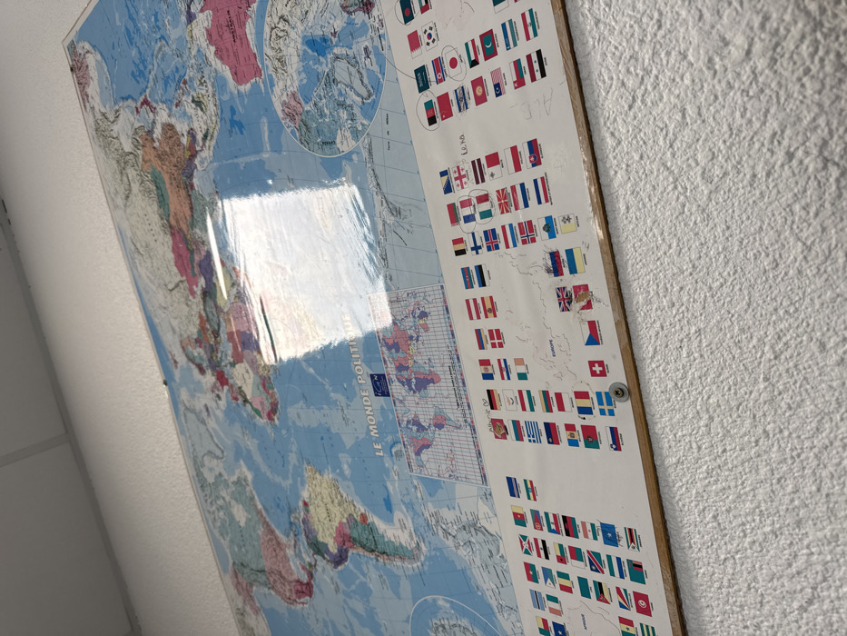 The image displays a large, laminated political world map prominently mounted on a textured white wall in the city of Schiltigheim, France