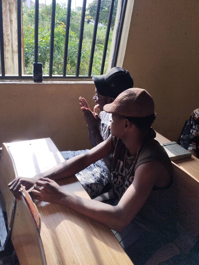 Two young individuals sit side-by-side at school desks. One wears a brown flat cap and a dark sleeveless shirt, looking to the right. The other, in a black baseball cap and light t-shirt, gazes forward with hands clasped. A barred window behind them shows greenery. A cell phone is on the window's sill. A bag is visible on the right side.