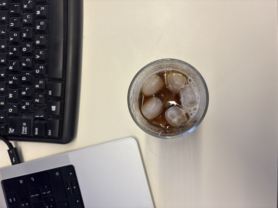 This image depicts an overhead view of a light-colored desk surface in Ness Ziona, Israel. Centrally positioned in the lower half is a clear glass containing iced coffee with six distinct ice cubes and a layer of light foam. To the upper left, the silver-colored casing and black keyboard of a laptop are partially visible, with a black USB-C cable connected to its left side. To the upper right, a black external keyboard with both English and Hebrew characters is partially visible. No people are present, and no actions or interactions are occurring.