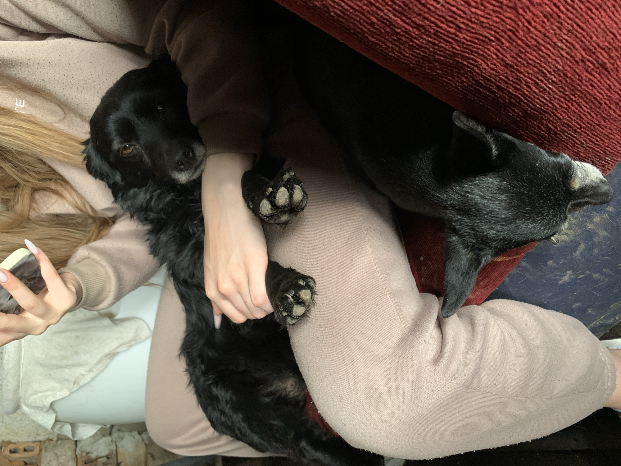 This image depicts an indoor scene in Lehchevo, Bulgaria. A female individual, identified by light-brown hair and wearing a light-pink, pilled long-sleeved top and matching sweatpants, is seated. She holds a dark-colored smartphone or similar device with a light-colored back in her right hand; her fingernails are light pink and elongated. Resting across her lap is a medium-sized, black, furry dog with brown eyes, which appears to be sleeping or resting its head on her left arm. The dog's paws show signs of dirt. The woman's left hand is resting on the dog's body. Partially visible below her right leg and to the right of the frame is a second, smaller black dog with a grey muzzle, resting against a red, ribbed fabric cushion. In the background to the left, a white cylindrical object, possibly a fermentation vessel or water container, is covered with a light-colored cloth. A brick wall is visible behind this object.