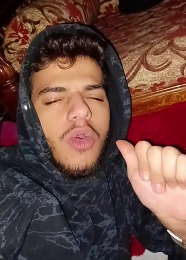 A young man with tan skin, dark curly hair, and a short beard, wearing a dark gray hoodie with a marble pattern, is lying on a bed with patterned pillows and a red sheet. He closes his eyes and makes kissing gestures with his lips, then points to his nose and smiles. He appears to be indoors.