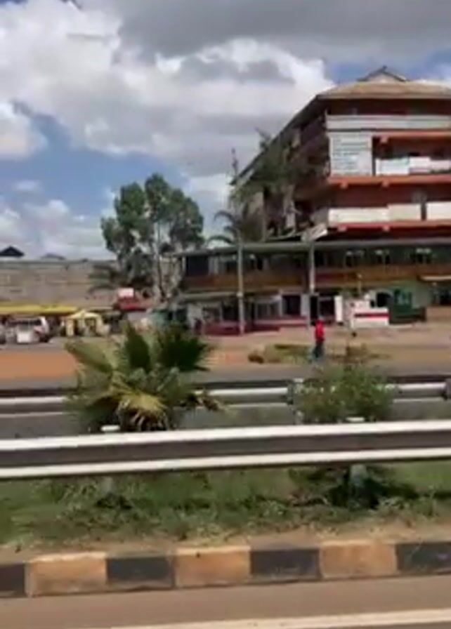 view from a moving vehicle on a road. The background includes a four-story building with a brown facade, green vegetation, and a partly cloudy sky. A white car is briefly visible in the foreground. As the vehicle moves, other vehicles and motorbikes can be seen moving on the road. The view is partially obstructed by a guardrail. The environment appears to be a roadside setting in a suburban or urban area. The audio includes background music.