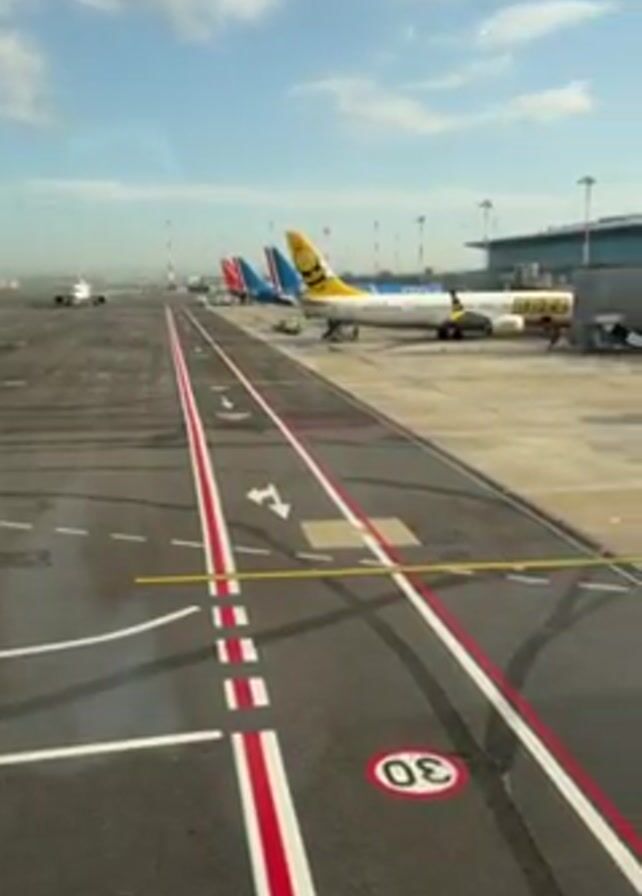 n airport runway and terminal. Several airplanes are parked on the tarmac, including one with a yellow tail. The runway is marked with white and red lines and arrows. The sky is blue with some clouds.