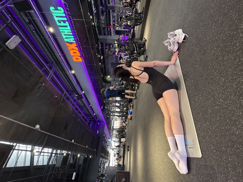 The image depicts the interior of a DDX ATHLETIC gym located in Kazan, Russia. In the foreground, a female with dark hair, wearing a black athletic unitard and white mid-calf socks, is positioned on a light grey yoga mat. She is performing an upward-facing dog yoga pose, with her body extended and supported by her hands, head tilted slightly upwards. A pair of light-colored athletic shoes rests on the dark grey speckled rubber floor to her immediate right. In the mid-ground, a male with reddish-brown hair, wearing a blue t-shirt and dark shorts, stands facing away from the camera, near various exercise equipment. His reflection is visible in the large mirrors lining the back wall. Another individual in a blue top is visible lying prone on the floor further in the mid-ground. The background shows additional gym users and a variety of fitness equipment, including weight racks and machines. The gym features a high ceiling with exposed black ductwork, structural beams, and a combination of overhead lighting and purple LED strip lighting illuminating a prominent "DDX ATHLETIC" sign with orange and green letters. A large skylight or window structure is visible on the upper left portion of the ceiling.