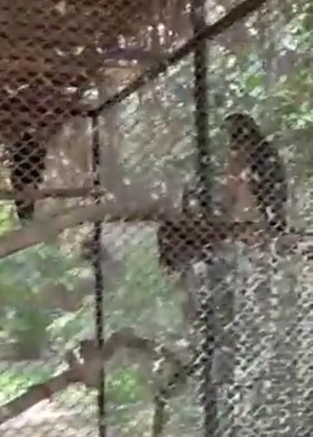 two birds in a cage. One bird is mostly brown with some black markings, and the other is primarily black with some white markings. They are perched on tree branches within the cage. The cage is made of metal mesh, and the roof is covered with straw. Green foliage is visible outside the cage.