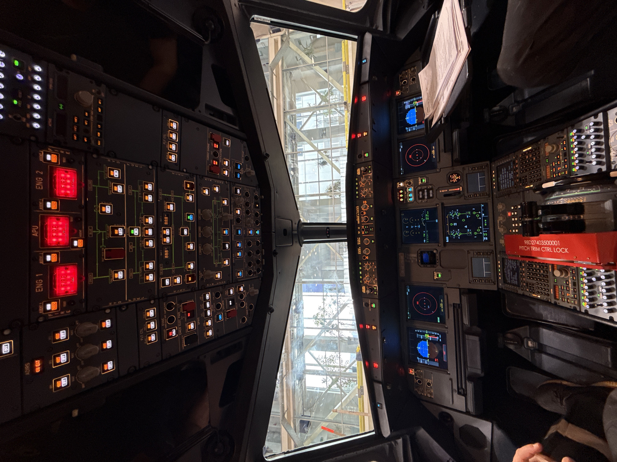 interior of an aircraft cockpit. The control panels on both sides of the cockpit are visible, with numerous buttons, switches, and display screens illuminated. Prominent warnings, like "ENG 1 FIRE" and "ENG 2 FIRE," are indicated in red. A red box labeled "PITCH TRIM CTRL LOCK" is located near the controls on the right side of the cockpit. Outside the cockpit windows, there is a view of a building with glass panels and a visible internal structure, including plants. It is impossible to pinpoint the exact location in Sofia, Bulgaria, without additional information. The image also shows the presence of at least one person; the legs, arms, and hands of a person sitting in one of the pilot seats are visible.
