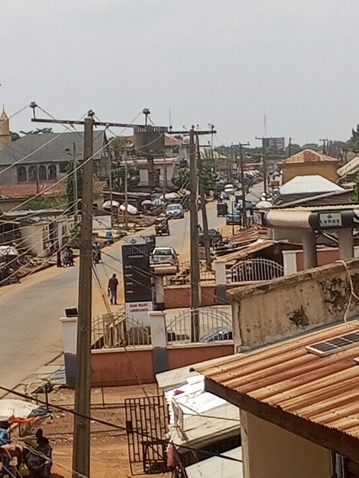This image presents an elevated, wide view of a street in Oko Erin, Nigeria, under a bright, diffused sky