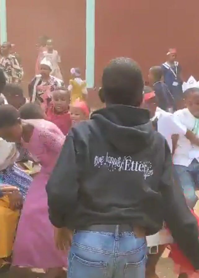 A large group of children and adults are gathered outdoors, possibly in a schoolyard or playground