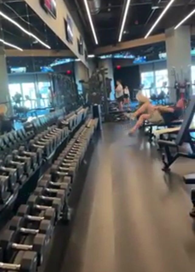 interior of a gym. On the left, a long row of dumbbells lines the wall, reflected in a mirror. In the center of the frame, workout benches sit on the glossy black floor. People are spread throughout the gym, using treadmills and weight machines. A woman walks toward the camera, carrying a white towel. The gym features black ceilings with linear lighting, and large windows letting in daylight.