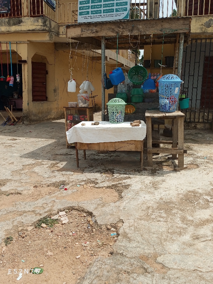 street stall in Ado-Ekiti, Nigeria. The stall is located in front of a building with a wooden awning. The stall is selling household items, such as plastic buckets, baskets, and cleaning supplies. The stall is set up on a concrete surface, which is cracked and uneven. There are two wooden tables and a wooden stool at the stall. The stall is empty of customers. The scene is captured from a slightly elevated perspective. The image was taken on a bright, sunny day. The environment is dusty and cluttered, with pieces of trash scattered about. The only sign of life is the inscription of "E52N7.0" on the bottom left of the image. The stall appears to be located at coordinates (latitude: 7.633, longitude: 5.206). There is a large, blue-green plastic container, a smaller green plastic container, a blue plastic basket, and a small, plastic bottle. The image was taken in a busy, commercial area of the city, likely on a street corner or in a marketplace. The stall owner is likely away from the stall, potentially tending to other business.