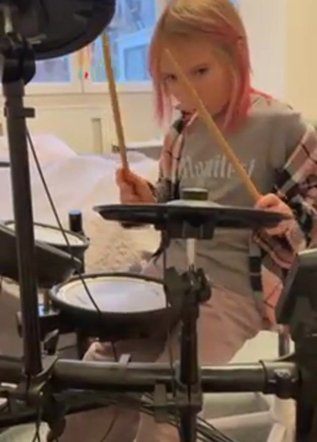 A young girl is playing an electronic drum set. She has blonde hair with streaks of pink and is wearing a grey sweatshirt that says "Manifest" and pink sweatpants. A lollipop is in her mouth as she plays. The drum set is black and has multiple pads and cymbals. The scene is indoors, in a bedroom. A bed is visible in the background.