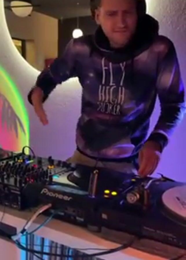 A man with shoulder-length hair pulled back in a bun, wearing headphones and a hoodie, stands behind a Pioneer DJ console
